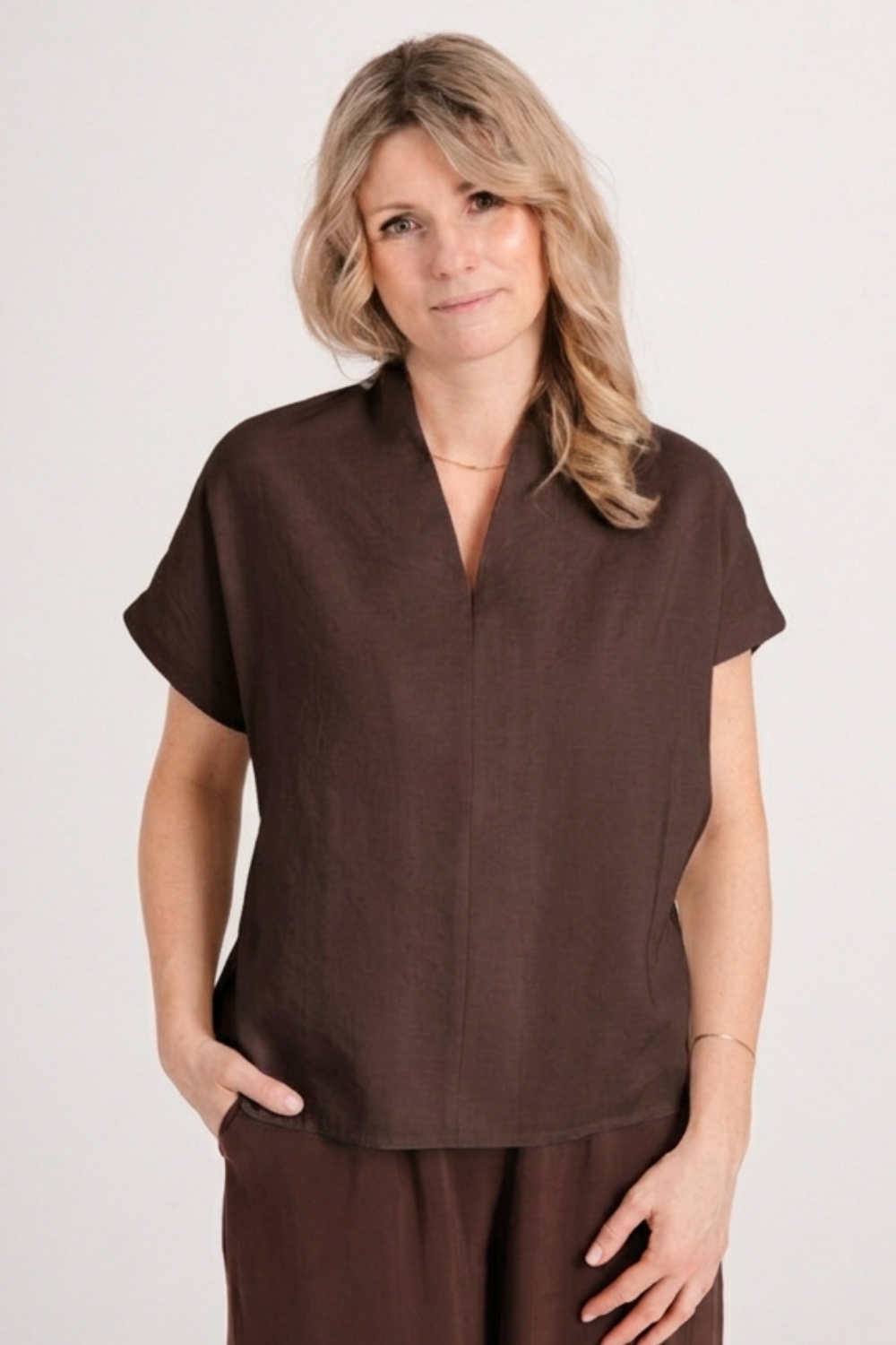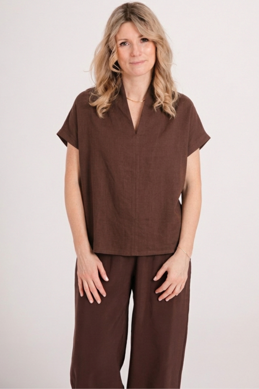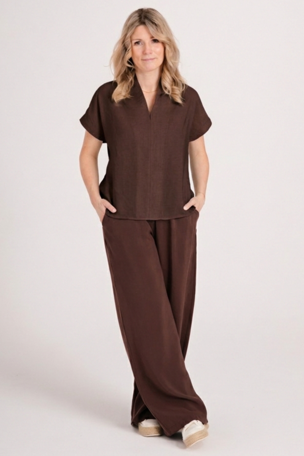 Krótki rękaw, dekolt w literę V i delikatna stójka dodają jej kobiecego charakteru – to taki detal, który robi całą robotę. Ze spodniami LIAM w tym samym odcieniu tworzy stylowy duet, który sprawdzi się zarówno na co dzień, jak i w bardziej eleganckiej wersji – np. z sandałami na obcasie i biżuterią. To jeden z tych zestawów, który wygląda dobrze zawsze i wszędzie, a Ty nie musisz się nad nim długo zastanawiać.