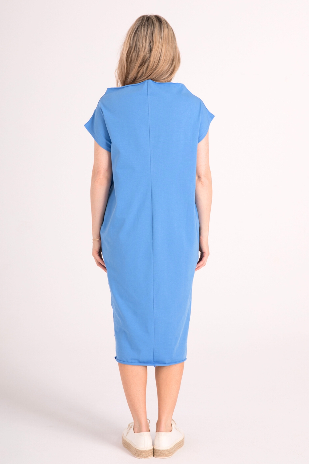 Sukienka Neck z bawełny organicznej ma prosto cięty dekolt i kiszenie w szwach bocznych. Wykończenie przy dekolcie oraz na dole jest surowe przez co sukienka delikatnie się roluje.