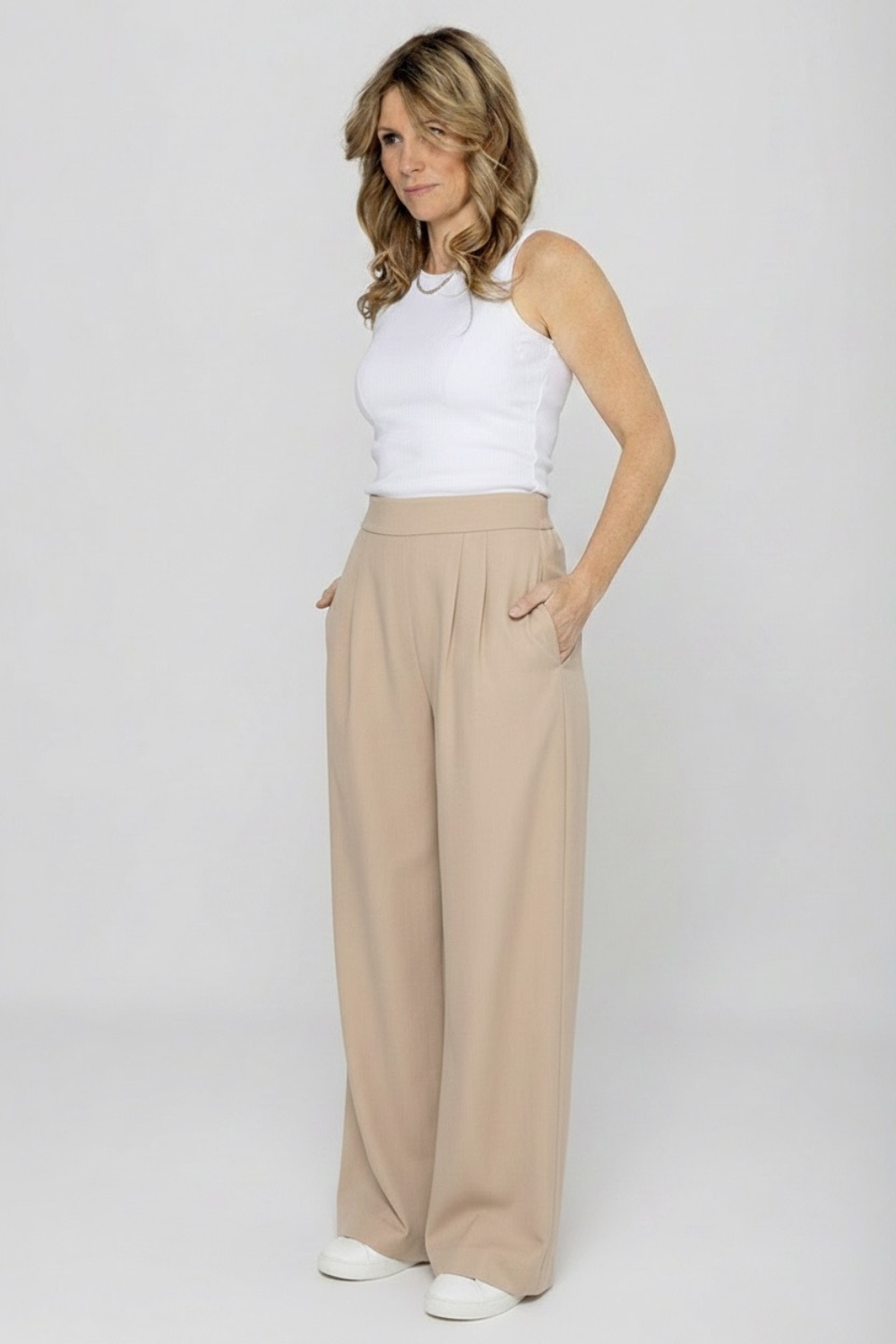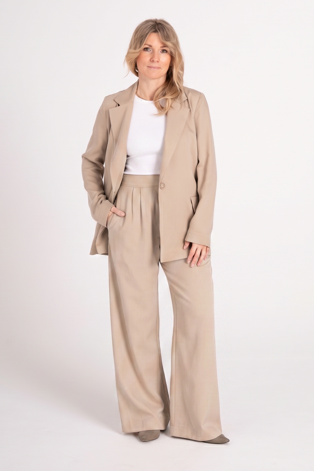 Spodnie wide leg świetnie komponują się z dopasowanym topem lub bluzką, marynarką oversize, a także ze sneakersami na co dzień lub szpilkami na wieczór. To spodnie biurowe, które sprawdzą się równie dobrze jako spodnie na wesele czy elegancką kolację. Proponujemy do nich marynarkę SILVIA w tym samym kolorze. Razem tworzą wygodny garnitur do noszenia na codzień lub od święta.